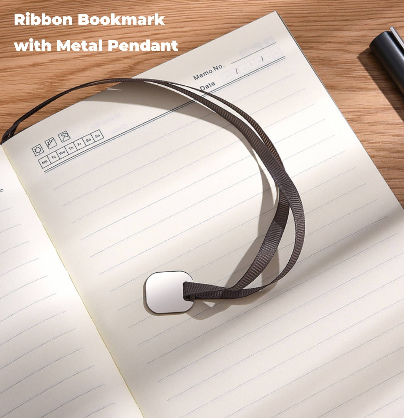 - Includes a ribbon bookmark with a metal pendant that can be customized with your company logo.